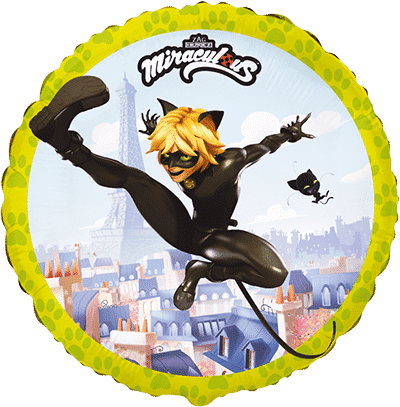 Кръгъл фолиев балон Miraculous Cat Noir с динамичен дизайн от популярната анимационна поредица. Подходящ за детски рожден ден и тематично парти с героите от „Калинката и Черния котарак“. Размер 18"/45 см – идеален за пълнене с хелий и използване в балонени букети и декорации. Подходящ и за пълнене с въздух. Балонът е произведен от Flexmetal и разполага с всички сертификати, изисквани от ЕС.