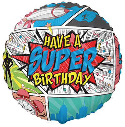 Кръгъл фолиев балон чрд в комикс стил с ефектен надпис „Have a Super Birthday“ и цветен графичен дизайн. Подходящ за детски рожден ден, тематично парти със супергерои или динамична украса за момче. Размер 18"/45 см – идеален за пълнене с хелий и използване в балонени букети и декорации. Подходящ и за пълнене с въздух. Балонът е произведен от Flexmetal и разполага с всички сертификати, изисквани от ЕС.