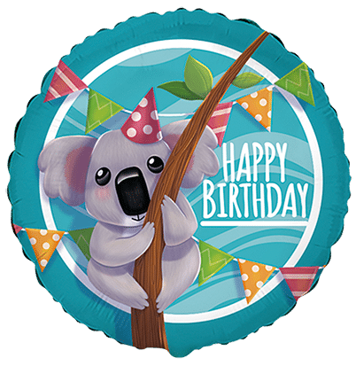 Кръгъл фолиев балон чрд с коала с весел детски дизайн и надпис Happy Birthday. Подходящ за детски рожден ден и тематични животински партита. Размер 18"/45 см – идеален за пълнене с хелий и използване в балонени букети и декорации. Изработен от висококачествено фолио с ясен и наситен печат. Подходящ и за пълнене с въздух.