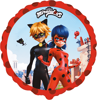 Кръгъл фолиев балон Miraculous Ladybug с дизайн на Лейди Бъг и Котарака от популярната анимационна поредица. Подходящ за детски рожден ден и тематично парти с любимите герои. Размер 18"/45 см – идеален за пълнене с хелий и използване в балонени букети и декорации. Подходящ и за пълнене с въздух. Балонът е произведен от Flexmetal и разполага с всички сертификати, изисквани от ЕС.