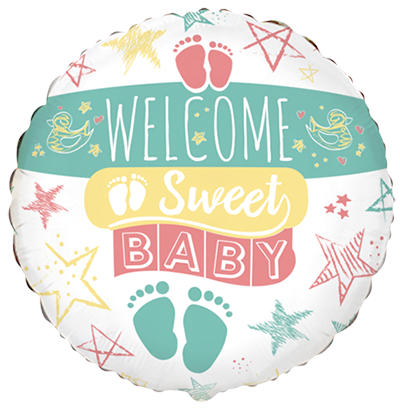 Кръгъл фолиев балон Welcome Sweet Baby с нежен дизайн и бебешки мотиви, подходящ за изписване, бебешко парти и посрещане на новородено. Универсален модел, подходящ както за момче, така и за момиче. Размер 18"/45 см – идеален за пълнене с хелий и използване в балонени букети и украси. Подходящ и за пълнене с въздух. Балонът е произведен от Flexmetal и разполага с всички сертификати, изисквани от ЕС.