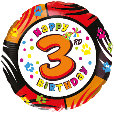 Кръгъл фолиев балон чрд 3 години с цветен и весел дизайн и голяма цифра 3 в центъра. Подходящ за украса на детски рожден ден и тематично парти за 3-ти рожден ден. Размер 18"/45 см – идеален за пълнене с хелий и използване в балонени букети и декорации. Подходящ и за пълнене с въздух. Балонът е произведен от Flexmetal и разполага с всички сертификати, изисквани от ЕС.