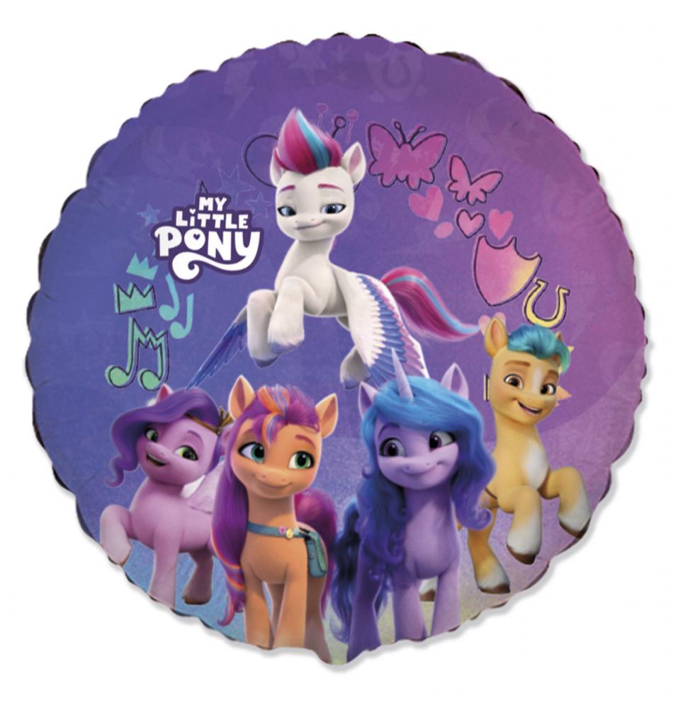 Кръгъл фолиев балон My Little Pony лилав с цветен дизайн и няколко от любимите герои от популярната анимация. Подходящ за детски рожден ден и тематично парти с пони. Размер 18"/45 см – идеален за пълнене с хелий и използване в балонени букети и декорации. Подходящ и за пълнене с въздух. Балонът е произведен от Flexmetal и разполага с всички сертификати, изисквани от ЕС.