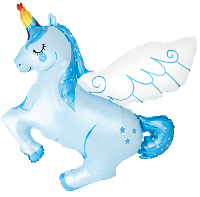 Фолиев балон еднорог с крила 113 см в нежни сини тонове и приказен дизайн. Големият размер го прави впечатляващ акцент в декорацията и отличен избор за детски рожден ден, парти с тема еднорог или приказна украса.