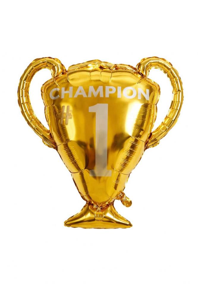Фолиев балон купа шампион 90 см със златист дизайн и надпис „Champion #1“. Перфектен за спортни събития, награждаване, рожден ден или парти с победителска тематика. Големият размер го прави силен акцент в декорацията и е подходящ както за самостоятелно използване, така и в балонени аранжировки. Подходящ за пълнене с хелий или въздух. Балонът е произведен от Flexmetal и разполага с всички сертификати, изисквани от ЕС.